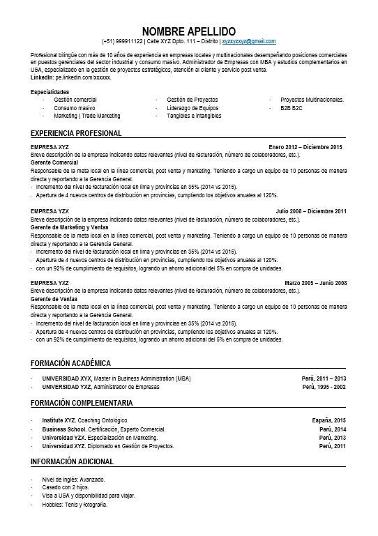 - Experiencia profesional: Detallada en orden cronológico inverso, incluyendo cargo, empresa, ubicación, fechas y logros cuantificables.